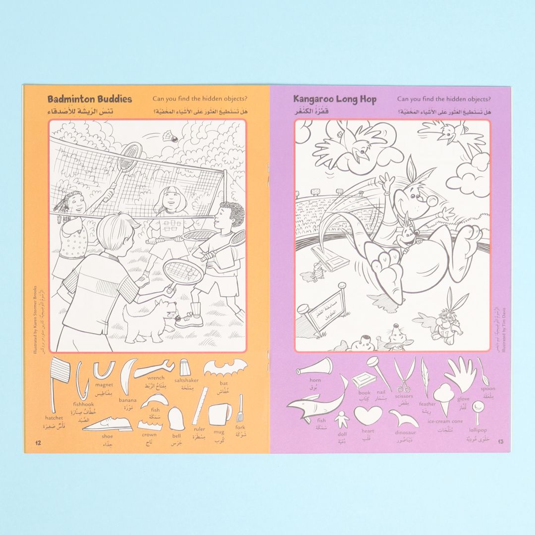 يبحث الطفل فيه عن صور مخفية في رسمة مفصّلة جاهزة للتلوين، تتواجد هذه الصور على طرف الكتاب باللغتين العربية والإنجليزية.
