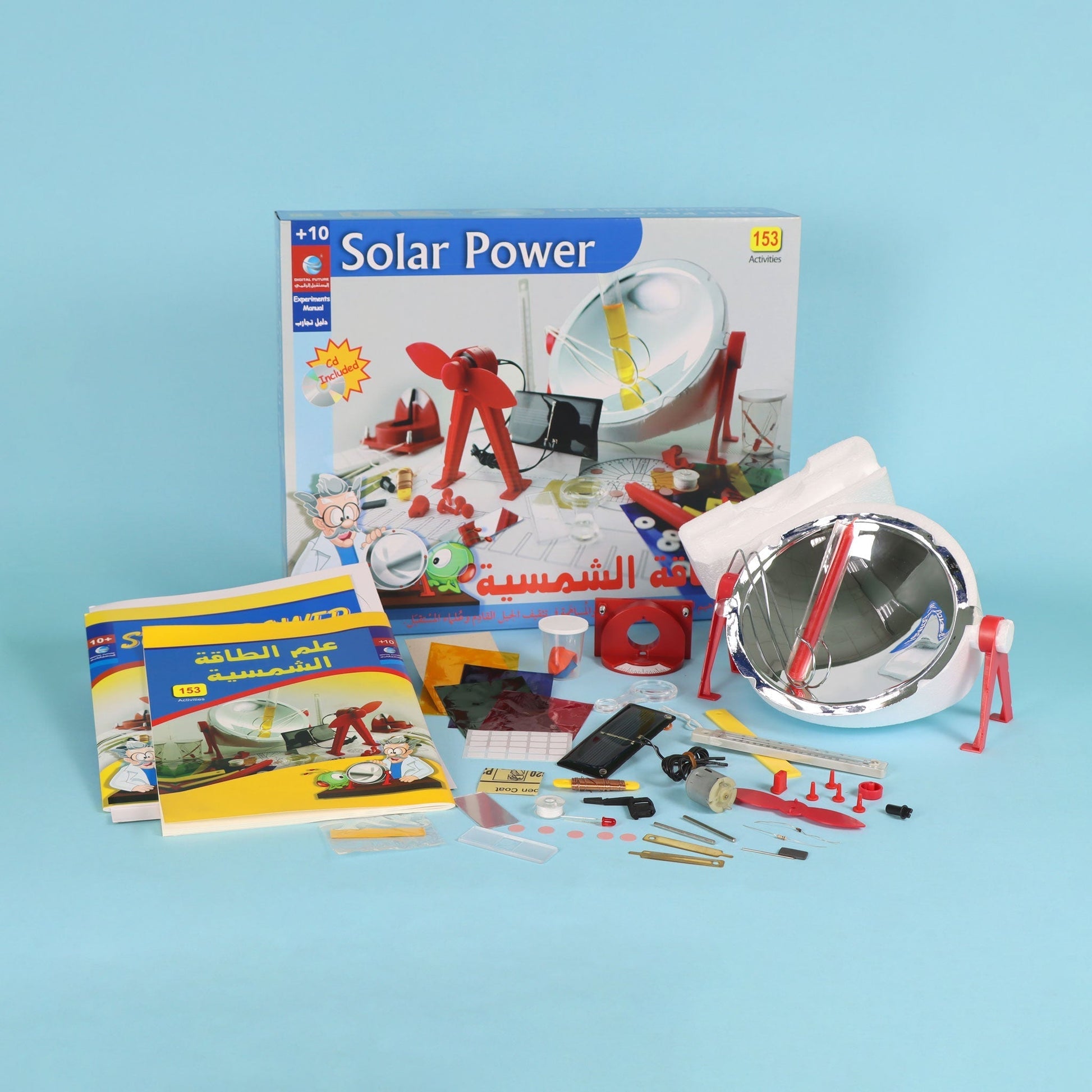 • تحتوي هذه المجموعة الخاصة بالطاقة الشمسية على كل الأدوات اللازمة للقيام بأكثر من 153 تجربة.
