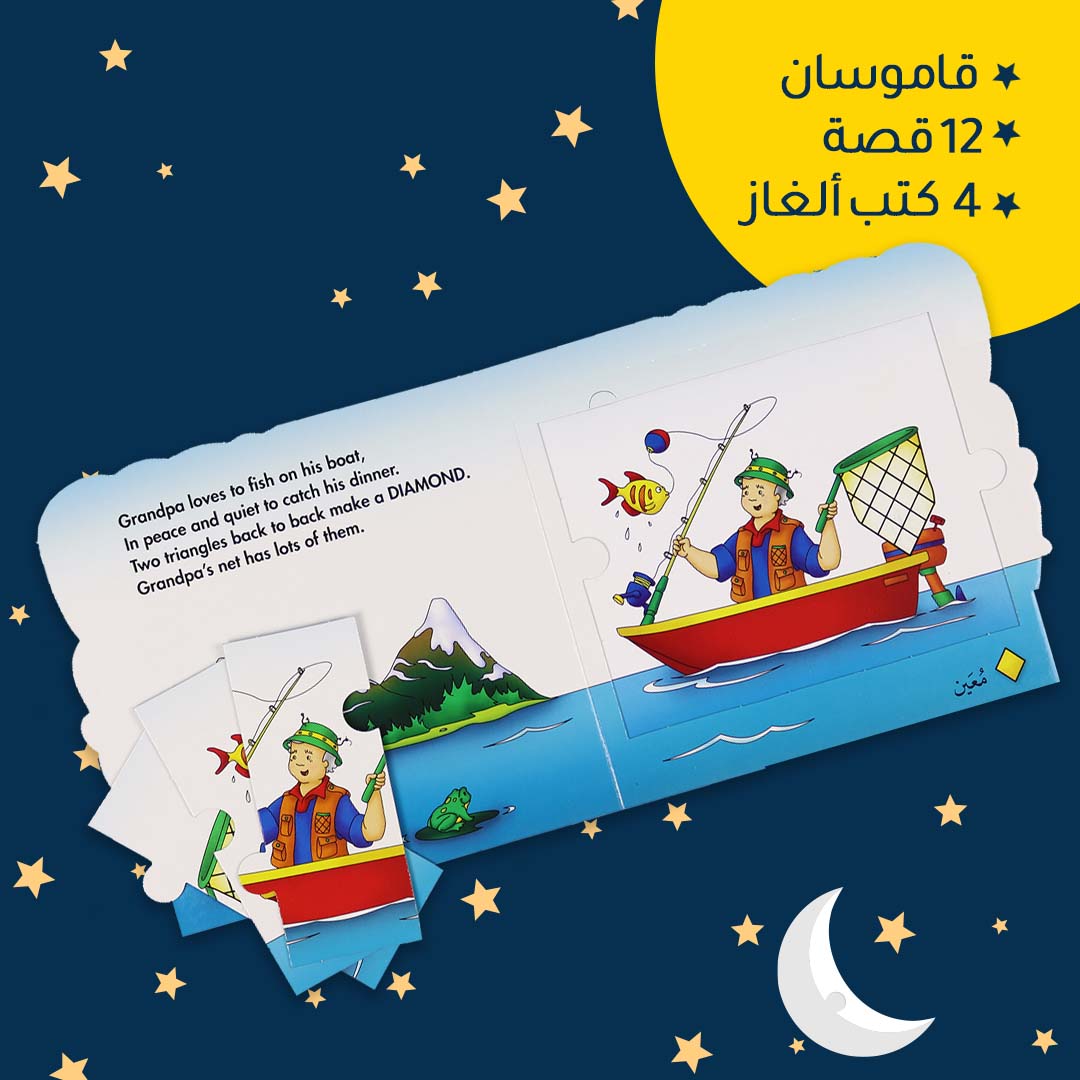 حقيبة تعليمية باللغتين العربية والانجليزية تتضمن: 12 قصة + 4 كتب بازل + قاموسان مصوّران للأطفال + 5 أقراص تعليمية