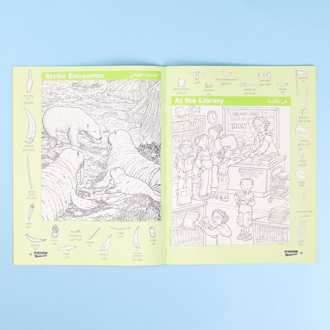 يبحث الطفل فيه عن صور مخفية في رسمة مفصّلة جاهزة للتلوين، تتواجد هذه الصور على طرف الكتاب باللغتين العربية والإنجليزية.